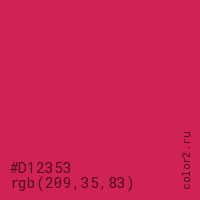 Цвет #D12353 в цветовой модели RGB обозначается тремя октетами (209, 35, 83) в десятичном формате и #D12353 в шестнадцатиричном (hex) формате, которые являются интенсивностью красного 209 (hex D1), интенсивность зелёного 35 (hex 23) и интенсивность синего 83 (hex 53).
