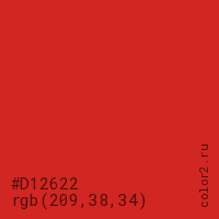 Цвет #D12622 в цветовой модели RGB обозначается тремя октетами (209, 38, 34) в десятичном формате и #D12622 в шестнадцатиричном (hex) формате, которые являются интенсивностью красного 209 (hex D1), интенсивность зелёного 38 (hex 26) и интенсивность синего 34 (hex 22).