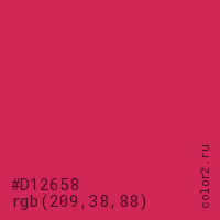Цвет #D12658 в цветовой модели RGB обозначается тремя октетами (209, 38, 88) в десятичном формате и #D12658 в шестнадцатиричном (hex) формате, которые являются интенсивностью красного 209 (hex D1), интенсивность зелёного 38 (hex 26) и интенсивность синего 88 (hex 58).