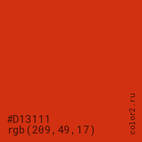 Цвет #D13111 в цветовой модели RGB обозначается тремя октетами (209, 49, 17) в десятичном формате и #D13111 в шестнадцатиричном (hex) формате, которые являются интенсивностью красного 209 (hex D1), интенсивность зелёного 49 (hex 31) и интенсивность синего 17 (hex 11).