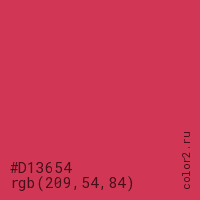 Цвет #D13654 в цветовой модели RGB обозначается тремя октетами (209, 54, 84) в десятичном формате и #D13654 в шестнадцатиричном (hex) формате, которые являются интенсивностью красного 209 (hex D1), интенсивность зелёного 54 (hex 36) и интенсивность синего 84 (hex 54).