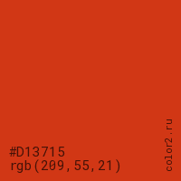 Цвет #D13715 в цветовой модели RGB обозначается тремя октетами (209, 55, 21) в десятичном формате и #D13715 в шестнадцатиричном (hex) формате, которые являются интенсивностью красного 209 (hex D1), интенсивность зелёного 55 (hex 37) и интенсивность синего 21 (hex 15).