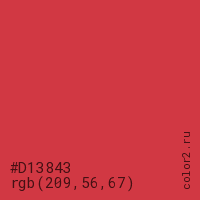 Цвет #D13843 в цветовой модели RGB обозначается тремя октетами (209, 56, 67) в десятичном формате и #D13843 в шестнадцатиричном (hex) формате, которые являются интенсивностью красного 209 (hex D1), интенсивность зелёного 56 (hex 38) и интенсивность синего 67 (hex 43).