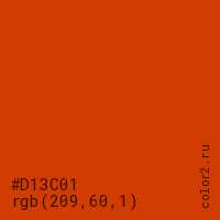 Цвет #D13C01 в цветовой модели RGB обозначается тремя октетами (209, 60, 1) в десятичном формате и #D13C01 в шестнадцатиричном (hex) формате, которые являются интенсивностью красного 209 (hex D1), интенсивность зелёного 60 (hex 3C) и интенсивность синего 1 (hex 01).
