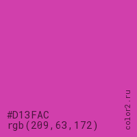 Цвет #D13FAC в цветовой модели RGB обозначается тремя октетами (209, 63, 172) в десятичном формате и #D13FAC в шестнадцатиричном (hex) формате, которые являются интенсивностью красного 209 (hex D1), интенсивность зелёного 63 (hex 3F) и интенсивность синего 172 (hex AC).