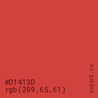 Цвет #D1413D в цветовой модели RGB обозначается тремя октетами (209, 65, 61) в десятичном формате и #D1413D в шестнадцатиричном (hex) формате, которые являются интенсивностью красного 209 (hex D1), интенсивность зелёного 65 (hex 41) и интенсивность синего 61 (hex 3D).