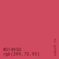 Цвет #D1495D в цветовой модели RGB обозначается тремя октетами (209, 73, 93) в десятичном формате и #D1495D в шестнадцатиричном (hex) формате, которые являются интенсивностью красного 209 (hex D1), интенсивность зелёного 73 (hex 49) и интенсивность синего 93 (hex 5D).
