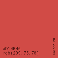 Цвет #D14B46 в цветовой модели RGB обозначается тремя октетами (209, 75, 70) в десятичном формате и #D14B46 в шестнадцатиричном (hex) формате, которые являются интенсивностью красного 209 (hex D1), интенсивность зелёного 75 (hex 4B) и интенсивность синего 70 (hex 46).