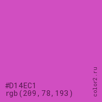 Цвет #D14EC1 в цветовой модели RGB обозначается тремя октетами (209, 78, 193) в десятичном формате и #D14EC1 в шестнадцатиричном (hex) формате, которые являются интенсивностью красного 209 (hex D1), интенсивность зелёного 78 (hex 4E) и интенсивность синего 193 (hex C1).