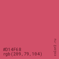 Цвет #D14F68 в цветовой модели RGB обозначается тремя октетами (209, 79, 104) в десятичном формате и #D14F68 в шестнадцатиричном (hex) формате, которые являются интенсивностью красного 209 (hex D1), интенсивность зелёного 79 (hex 4F) и интенсивность синего 104 (hex 68).