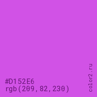 Цвет #D152E6 в цветовой модели RGB обозначается тремя октетами (209, 82, 230) в десятичном формате и #D152E6 в шестнадцатиричном (hex) формате, которые являются интенсивностью красного 209 (hex D1), интенсивность зелёного 82 (hex 52) и интенсивность синего 230 (hex E6).