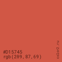 Цвет #D15745 в цветовой модели RGB обозначается тремя октетами (209, 87, 69) в десятичном формате и #D15745 в шестнадцатиричном (hex) формате, которые являются интенсивностью красного 209 (hex D1), интенсивность зелёного 87 (hex 57) и интенсивность синего 69 (hex 45).