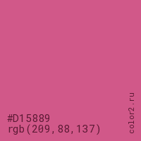 Цвет #D15889 в цветовой модели RGB обозначается тремя октетами (209, 88, 137) в десятичном формате и #D15889 в шестнадцатиричном (hex) формате, которые являются интенсивностью красного 209 (hex D1), интенсивность зелёного 88 (hex 58) и интенсивность синего 137 (hex 89).