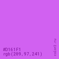 Цвет #D161F1 в цветовой модели RGB обозначается тремя октетами (209, 97, 241) в десятичном формате и #D161F1 в шестнадцатиричном (hex) формате, которые являются интенсивностью красного 209 (hex D1), интенсивность зелёного 97 (hex 61) и интенсивность синего 241 (hex F1).