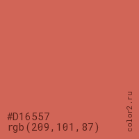 Цвет #D16557 в цветовой модели RGB обозначается тремя октетами (209, 101, 87) в десятичном формате и #D16557 в шестнадцатиричном (hex) формате, которые являются интенсивностью красного 209 (hex D1), интенсивность зелёного 101 (hex 65) и интенсивность синего 87 (hex 57).