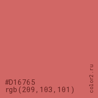 Цвет #D16765 в цветовой модели RGB обозначается тремя октетами (209, 103, 101) в десятичном формате и #D16765 в шестнадцатиричном (hex) формате, которые являются интенсивностью красного 209 (hex D1), интенсивность зелёного 103 (hex 67) и интенсивность синего 101 (hex 65).