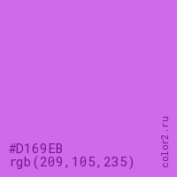 Цвет #D169EB в цветовой модели RGB обозначается тремя октетами (209, 105, 235) в десятичном формате и #D169EB в шестнадцатиричном (hex) формате, которые являются интенсивностью красного 209 (hex D1), интенсивность зелёного 105 (hex 69) и интенсивность синего 235 (hex EB).