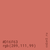 Цвет #D16F63 в цветовой модели RGB обозначается тремя октетами (209, 111, 99) в десятичном формате и #D16F63 в шестнадцатиричном (hex) формате, которые являются интенсивностью красного 209 (hex D1), интенсивность зелёного 111 (hex 6F) и интенсивность синего 99 (hex 63).