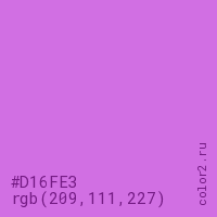Цвет #D16FE3 в цветовой модели RGB обозначается тремя октетами (209, 111, 227) в десятичном формате и #D16FE3 в шестнадцатиричном (hex) формате, которые являются интенсивностью красного 209 (hex D1), интенсивность зелёного 111 (hex 6F) и интенсивность синего 227 (hex E3).
