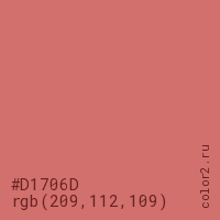 Цвет #D1706D в цветовой модели RGB обозначается тремя октетами (209, 112, 109) в десятичном формате и #D1706D в шестнадцатиричном (hex) формате, которые являются интенсивностью красного 209 (hex D1), интенсивность зелёного 112 (hex 70) и интенсивность синего 109 (hex 6D).