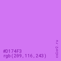 Цвет #D174F3 в цветовой модели RGB обозначается тремя октетами (209, 116, 243) в десятичном формате и #D174F3 в шестнадцатиричном (hex) формате, которые являются интенсивностью красного 209 (hex D1), интенсивность зелёного 116 (hex 74) и интенсивность синего 243 (hex F3).