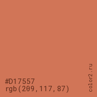 Цвет #D17557 в цветовой модели RGB обозначается тремя октетами (209, 117, 87) в десятичном формате и #D17557 в шестнадцатиричном (hex) формате, которые являются интенсивностью красного 209 (hex D1), интенсивность зелёного 117 (hex 75) и интенсивность синего 87 (hex 57).