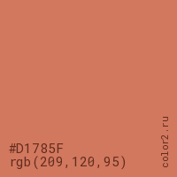 Цвет #D1785F в цветовой модели RGB обозначается тремя октетами (209, 120, 95) в десятичном формате и #D1785F в шестнадцатиричном (hex) формате, которые являются интенсивностью красного 209 (hex D1), интенсивность зелёного 120 (hex 78) и интенсивность синего 95 (hex 5F).