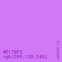 Цвет #D178F5 в цветовой модели RGB обозначается тремя октетами (209, 120, 245) в десятичном формате и #D178F5 в шестнадцатиричном (hex) формате, которые являются интенсивностью красного 209 (hex D1), интенсивность зелёного 120 (hex 78) и интенсивность синего 245 (hex F5).