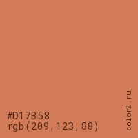 Цвет #D17B58 в цветовой модели RGB обозначается тремя октетами (209, 123, 88) в десятичном формате и #D17B58 в шестнадцатиричном (hex) формате, которые являются интенсивностью красного 209 (hex D1), интенсивность зелёного 123 (hex 7B) и интенсивность синего 88 (hex 58).