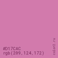 Цвет #D17CAC в цветовой модели RGB обозначается тремя октетами (209, 124, 172) в десятичном формате и #D17CAC в шестнадцатиричном (hex) формате, которые являются интенсивностью красного 209 (hex D1), интенсивность зелёного 124 (hex 7C) и интенсивность синего 172 (hex AC).