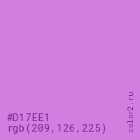 Цвет #D17EE1 в цветовой модели RGB обозначается тремя октетами (209, 126, 225) в десятичном формате и #D17EE1 в шестнадцатиричном (hex) формате, которые являются интенсивностью красного 209 (hex D1), интенсивность зелёного 126 (hex 7E) и интенсивность синего 225 (hex E1).
