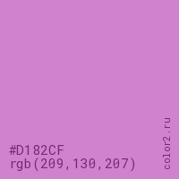 Цвет #D182CF в цветовой модели RGB обозначается тремя октетами (209, 130, 207) в десятичном формате и #D182CF в шестнадцатиричном (hex) формате, которые являются интенсивностью красного 209 (hex D1), интенсивность зелёного 130 (hex 82) и интенсивность синего 207 (hex CF).