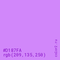 Цвет #D187FA в цветовой модели RGB обозначается тремя октетами (209, 135, 250) в десятичном формате и #D187FA в шестнадцатиричном (hex) формате, которые являются интенсивностью красного 209 (hex D1), интенсивность зелёного 135 (hex 87) и интенсивность синего 250 (hex FA).