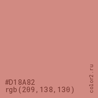 Цвет #D18A82 в цветовой модели RGB обозначается тремя октетами (209, 138, 130) в десятичном формате и #D18A82 в шестнадцатиричном (hex) формате, которые являются интенсивностью красного 209 (hex D1), интенсивность зелёного 138 (hex 8A) и интенсивность синего 130 (hex 82).