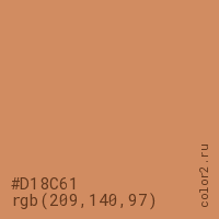 Цвет #D18C61 в цветовой модели RGB обозначается тремя октетами (209, 140, 97) в десятичном формате и #D18C61 в шестнадцатиричном (hex) формате, которые являются интенсивностью красного 209 (hex D1), интенсивность зелёного 140 (hex 8C) и интенсивность синего 97 (hex 61).