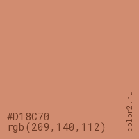 Цвет #D18C70 в цветовой модели RGB обозначается тремя октетами (209, 140, 112) в десятичном формате и #D18C70 в шестнадцатиричном (hex) формате, которые являются интенсивностью красного 209 (hex D1), интенсивность зелёного 140 (hex 8C) и интенсивность синего 112 (hex 70).