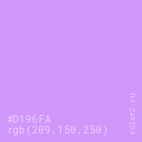 Цвет #D196FA в цветовой модели RGB обозначается тремя октетами (209, 150, 250) в десятичном формате и #D196FA в шестнадцатиричном (hex) формате, которые являются интенсивностью красного 209 (hex D1), интенсивность зелёного 150 (hex 96) и интенсивность синего 250 (hex FA).