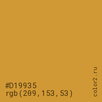 Цвет #D19935 в цветовой модели RGB обозначается тремя октетами (209, 153, 53) в десятичном формате и #D19935 в шестнадцатиричном (hex) формате, которые являются интенсивностью красного 209 (hex D1), интенсивность зелёного 153 (hex 99) и интенсивность синего 53 (hex 35).