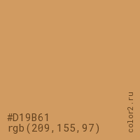 Цвет #D19B61 в цветовой модели RGB обозначается тремя октетами (209, 155, 97) в десятичном формате и #D19B61 в шестнадцатиричном (hex) формате, которые являются интенсивностью красного 209 (hex D1), интенсивность зелёного 155 (hex 9B) и интенсивность синего 97 (hex 61).