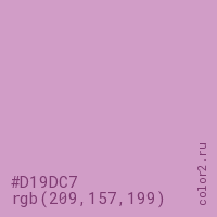 Цвет #D19DC7 в цветовой модели RGB обозначается тремя октетами (209, 157, 199) в десятичном формате и #D19DC7 в шестнадцатиричном (hex) формате, которые являются интенсивностью красного 209 (hex D1), интенсивность зелёного 157 (hex 9D) и интенсивность синего 199 (hex C7).