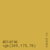 Цвет #D1AF46 в цветовой модели RGB обозначается тремя октетами (209, 175, 70) в десятичном формате и #D1AF46 в шестнадцатиричном (hex) формате, которые являются интенсивностью красного 209 (hex D1), интенсивность зелёного 175 (hex AF) и интенсивность синего 70 (hex 46).