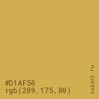 Цвет #D1AF50 в цветовой модели RGB обозначается тремя октетами (209, 175, 80) в десятичном формате и #D1AF50 в шестнадцатиричном (hex) формате, которые являются интенсивностью красного 209 (hex D1), интенсивность зелёного 175 (hex AF) и интенсивность синего 80 (hex 50).