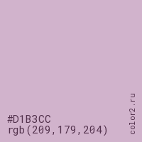 Цвет #D1B3CC в цветовой модели RGB обозначается тремя октетами (209, 179, 204) в десятичном формате и #D1B3CC в шестнадцатиричном (hex) формате, которые являются интенсивностью красного 209 (hex D1), интенсивность зелёного 179 (hex B3) и интенсивность синего 204 (hex CC).