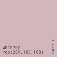 Цвет #D1B7BC в цветовой модели RGB обозначается тремя октетами (209, 183, 188) в десятичном формате и #D1B7BC в шестнадцатиричном (hex) формате, которые являются интенсивностью красного 209 (hex D1), интенсивность зелёного 183 (hex B7) и интенсивность синего 188 (hex BC).