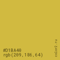 Цвет #D1BA40 в цветовой модели RGB обозначается тремя октетами (209, 186, 64) в десятичном формате и #D1BA40 в шестнадцатиричном (hex) формате, которые являются интенсивностью красного 209 (hex D1), интенсивность зелёного 186 (hex BA) и интенсивность синего 64 (hex 40).