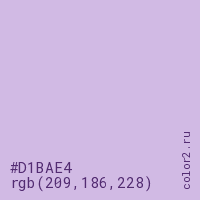 Цвет #D1BAE4 в цветовой модели RGB обозначается тремя октетами (209, 186, 228) в десятичном формате и #D1BAE4 в шестнадцатиричном (hex) формате, которые являются интенсивностью красного 209 (hex D1), интенсивность зелёного 186 (hex BA) и интенсивность синего 228 (hex E4).