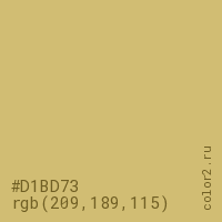 Цвет #D1BD73 в цветовой модели RGB обозначается тремя октетами (209, 189, 115) в десятичном формате и #D1BD73 в шестнадцатиричном (hex) формате, которые являются интенсивностью красного 209 (hex D1), интенсивность зелёного 189 (hex BD) и интенсивность синего 115 (hex 73).