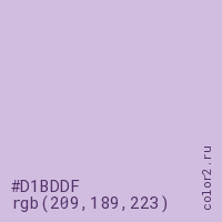 Цвет #D1BDDF в цветовой модели RGB обозначается тремя октетами (209, 189, 223) в десятичном формате и #D1BDDF в шестнадцатиричном (hex) формате, которые являются интенсивностью красного 209 (hex D1), интенсивность зелёного 189 (hex BD) и интенсивность синего 223 (hex DF).