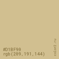 Цвет #D1BF90 в цветовой модели RGB обозначается тремя октетами (209, 191, 144) в десятичном формате и #D1BF90 в шестнадцатиричном (hex) формате, которые являются интенсивностью красного 209 (hex D1), интенсивность зелёного 191 (hex BF) и интенсивность синего 144 (hex 90).