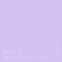 Цвет #D1C2F2 в цветовой модели RGB обозначается тремя октетами (209, 194, 242) в десятичном формате и #D1C2F2 в шестнадцатиричном (hex) формате, которые являются интенсивностью красного 209 (hex D1), интенсивность зелёного 194 (hex C2) и интенсивность синего 242 (hex F2).